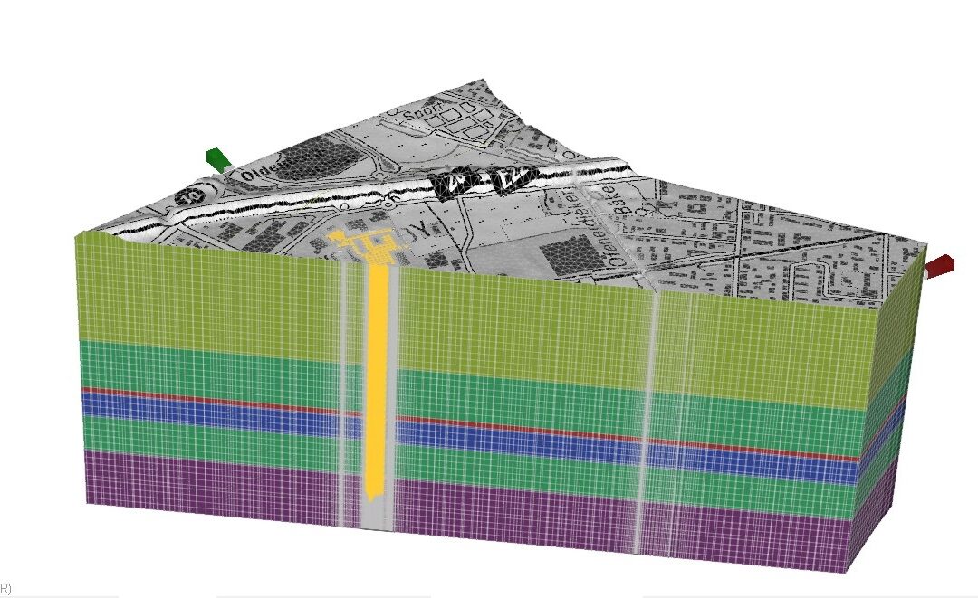 Ein zentraler Bestandteil des Energiekonzeptes ist die Nutzung von oberflächennaher Geothermie. Die AKVO GmbH aus Berlin hat gemeinsam mit der aQua-thermic Ingenieurgesellschaft mbH aus Strausberg seit 2024 die Vorplanung, Entwurfsplanung, Genehmigungsplanung sowie die Ausführungsplanung für das geothermische System durchgeführt. Unter anderem wurden drei Testbohrungen begleitet, um die Eigenschaften des Untergrundes erkunden zu können. Darauf aufbauend erfolgte die Auslegung der Geothermieanlage, d.h. Anzahl, Tiefe und Konfiguration der Erdwärmesonden wurde ermittelt. Im Anschluss erfolgte eine komplexe 3D-Simulation der Umweltauswirkungen, d.h. die Erwärmung im Sommer und die Abkühlung im Winter des Untergrundes durch die Wärmeentnahme wurden über 25 Jahre modelliert. Herausfordernd war dabei die sukzessiv anwachsende Geothermieanlage korrekt umzusetzen, denn im ersten Bauabschnitt werden 57 Erdwärmesonden in Betrieb genommen. Einige Jahre versetzt folgen weitere Erdwärmesonden.